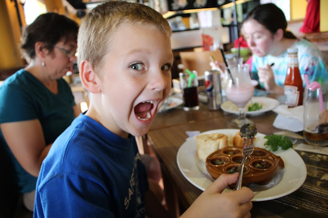 Finn's second experience with details -- much different than his first and a more traditional way they are served, smothered in melted butter and garlic: